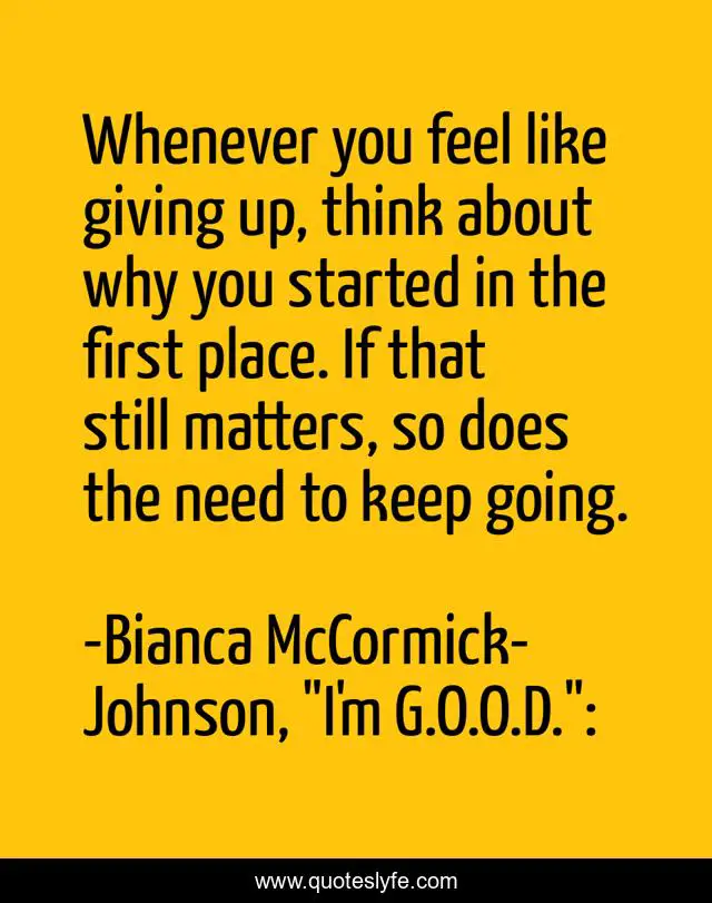 This page presents the quote "Whenever you feel like giving up, think about why you started in the first place. If that still matters, so does the need to keep going.". Author of this quote is Bianca McCormick-Johnson, "I'm G.O.O.D.":. This quote is about confidence, positive, motivational, optimistic, inspirational, enthusiasm,.
