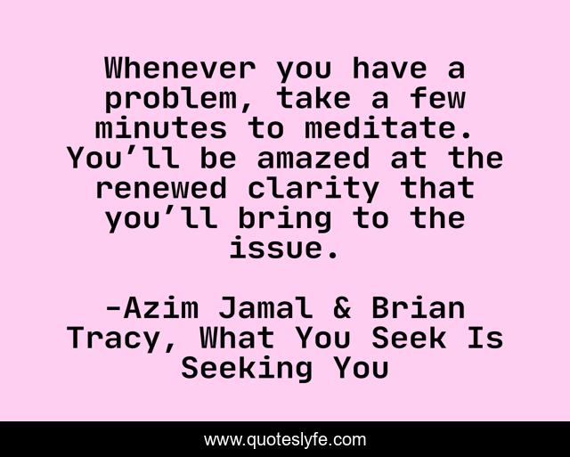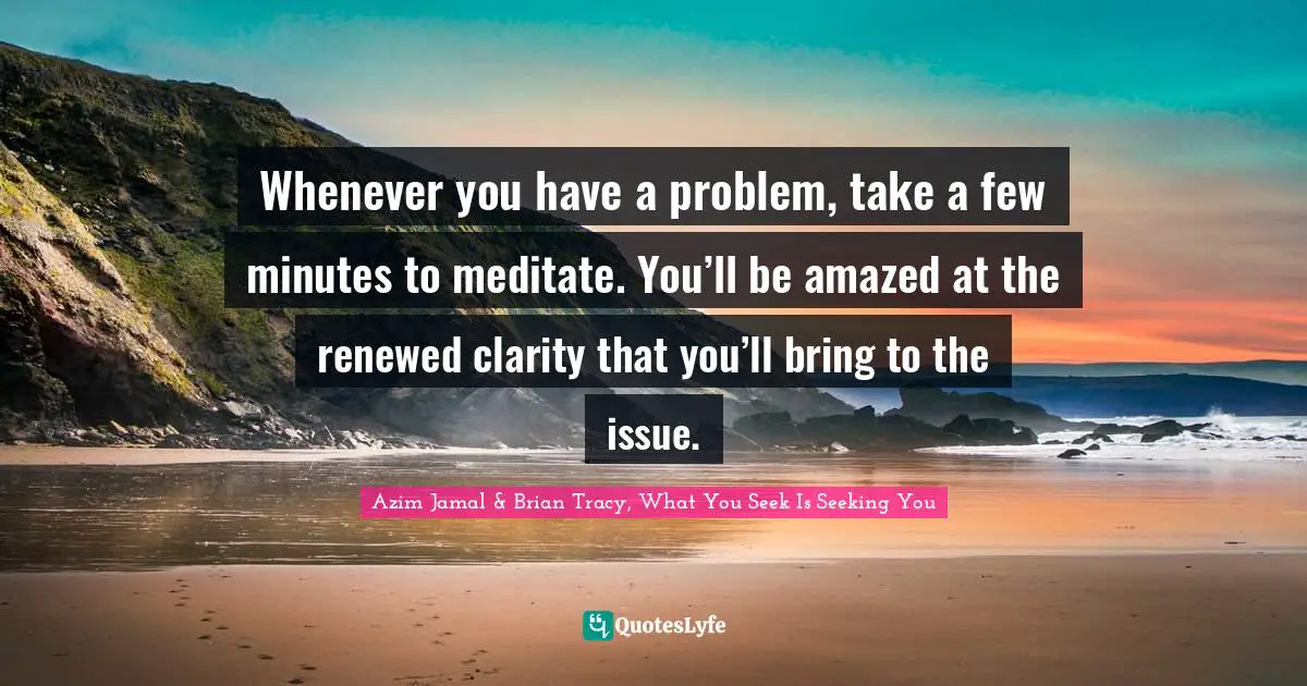This page presents the quote "Whenever you have a problem, take a few minutes to meditate. You’ll be amazed at the renewed clarity that you’ll bring to the issue.". Author of this quote is Azim Jamal & Brian Tracy, What You Seek Is Seeking You. This quote is about renewed, meditate, problem, clarity, meditation, amazed,.