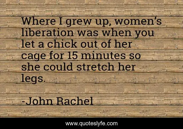 This page presents the quote "Where I grew up, women’s liberation was when you let a chick out of her cage for 15 minutes so she could stretch her legs.". Author of this quote is John Rachel. This quote is about women, cultural-relativism, womens-lib, feminism, incarceration,.