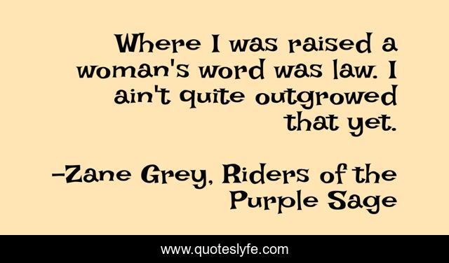This page presents the quote "Where I was raised a woman's word was law. I ain't quite outgrowed that yet.". Author of this quote is Zane Grey, Riders of the Purple Sage. This quote is about woman, law, women,.