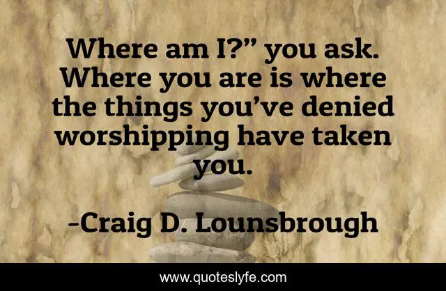 This page presents the quote "Where am I?” you ask. Where you are is where the things you’ve denied worshipping have taken you.". Author of this quote is Craig D. Lounsbrough. This quote is about deny, denial, lost, gods, confuse, confused, priorities, disoriented, priority,.