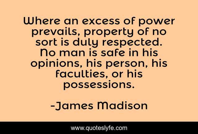 This page presents the quote "Where an excess of power prevails, property of no sort is duly respected. No man is safe in his opinions, his person, his faculties, or his possessions.". Author of this quote is James Madison. This quote is about opinions, man, person,.