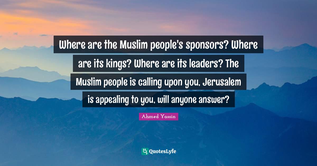 This page presents the quote "Where are the Muslim people's sponsors? Where are its kings? Where are its leaders? The Muslim people is calling upon you, Jerusalem is appealing to you, will anyone answer?". Author of this quote is Ahmed Yassin. This quote is about leader, kings, people, sponsors, calling, jerusalem,.
