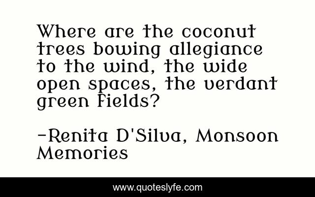 This page presents the quote "Where are the coconut trees bowing allegiance to the wind, the wide open spaces, the verdant green fields?". Author of this quote is Renita D'Silva, Monsoon Memories. This quote is about indian-fiction, women-s-fiction, india,.