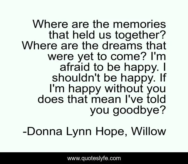 This page presents the quote "Where are the memories that held us together? Where are the dreams that were yet to come? I'm afraid to be happy. I shouldn't be happy. If I'm happy without you does that mean I've told you goodbye?". Author of this quote is Donna Lynn Hope, Willow. This quote is about letting-go, memories, goodbye, holding-on, broken-dreams, dreams,.