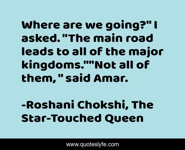 This page presents the quote "Where are we going?" I asked. "The main road leads to all of the major kingdoms.""Not all of them, " said Amar.". Author of this quote is Roshani Chokshi, The Star-Touched Queen. This quote is about fractured-folk-tale, paranormal-romance,.