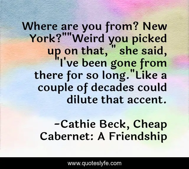 This page presents the quote "Where are you from? New York?""Weird you picked up on that, " she said, "I've been gone from there for so long."Like a couple of decades could dilute that accent.". Author of this quote is Cathie Beck, Cheap Cabernet: A Friendship. This quote is about cheap-cabernet-a-friendship, friendship, humor, memoir,.