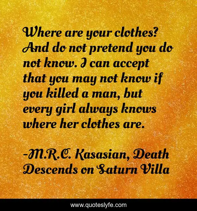 This page presents the quote "Where are your clothes? And do not pretend you do not know. I can accept that you may not know if you killed a man, but every girl always knows where her clothes are.". Author of this quote is M.R.C. Kasasian, Death Descends on Saturn Villa. This quote is about mystery, humor, clothes,.