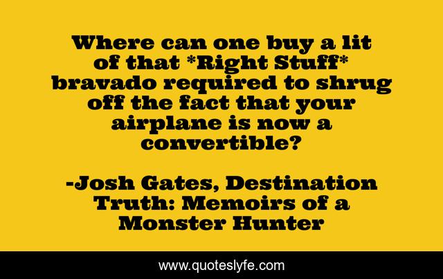 This page presents the quote "Where can one buy a lit of that *Right Stuff* bravado required to shrug off the fact that your airplane is now a convertible?". Author of this quote is Josh Gates, Destination Truth: Memoirs of a Monster Hunter. This quote is about travel, airplanes, archaeology, bravery,.