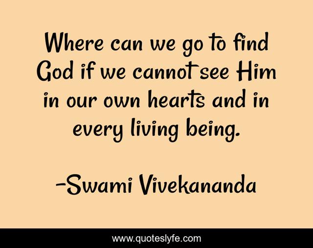 This page presents the quote "Where can we go to find God if we cannot see Him in our own hearts and in every living being.". Author of this quote is Swami Vivekananda. This quote is about living, see, find,.