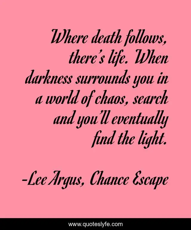 This page presents the quote "Where death follows, there’s life. When darkness surrounds you in a world of chaos, search and you’ll eventually find the light.". Author of this quote is Lee Argus, Chance Escape. This quote is about chance-escape, life, death, lee-argus, darkness, metaphorical, orion-lee-argus, metaphor,.