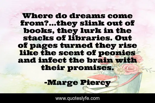 This page presents the quote "Where do dreams come from?...they slink out of books, they lurk in the stacks of libraries. Out of pages turned they rise like the scent of peonies and infect the brain with their promises.". Author of this quote is Marge Piercy. This quote is about books, dreams,.