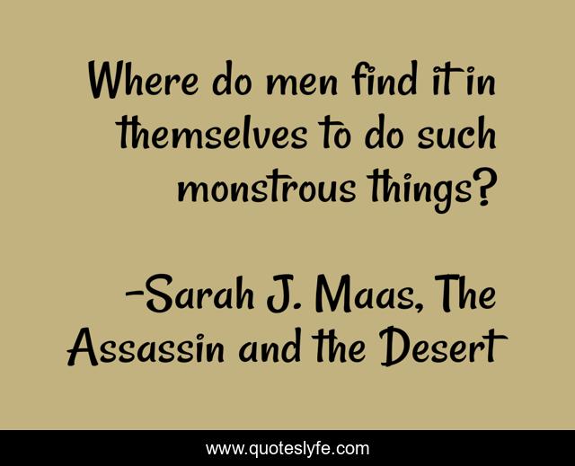 This page presents the quote "Where do men find it in themselves to do such monstrous things?". Author of this quote is Sarah J. Maas, The Assassin and the Desert. This quote is about monstruous, men,.