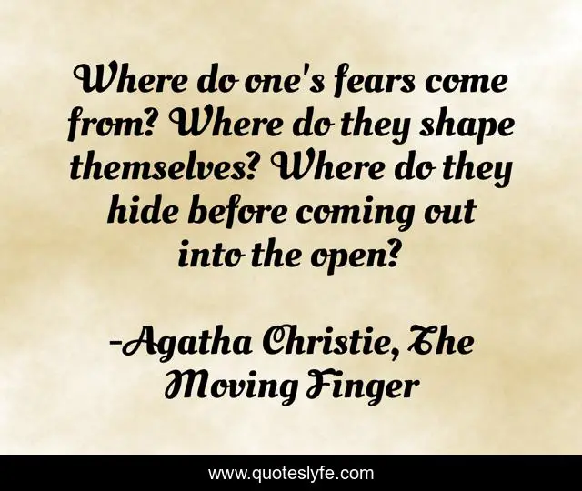 This page presents the quote "Where do one's fears come from? Where do they shape themselves? Where do they hide before coming out into the open?". Author of this quote is Agatha Christie, The Moving Finger. This quote is about philosophy, fears, questions,.