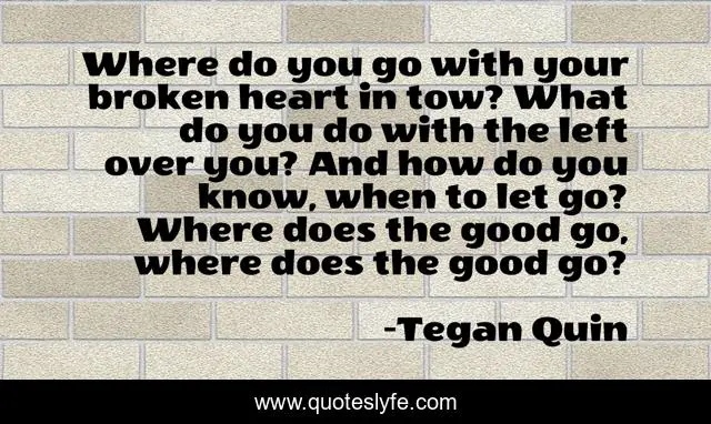 This page presents the quote "Where do you go with your broken heart in tow? What do you do with the left over you? And how do you know, when to let go? Where does the good go, where does the good go?". Author of this quote is Tegan Quin. This quote is about broken-heart, good, tegan-quin, tegan-and-sara, where-does-the-good-go, sara-quin,.
