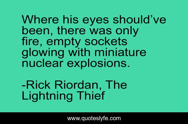This page presents the quote "Where his eyes should’ve been, there was only fire, empty sockets glowing with miniature nuclear explosions.". Author of this quote is Rick Riordan, The Lightning Thief. .