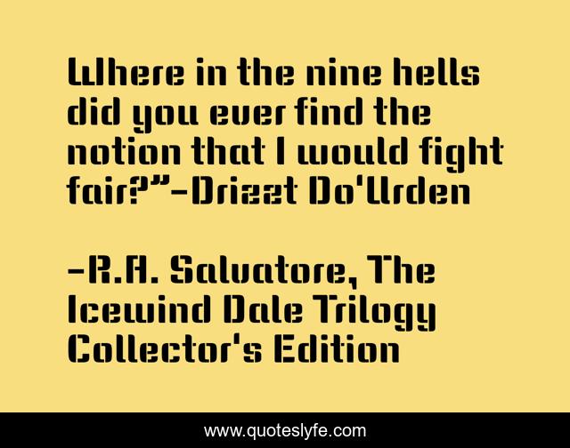 This page presents the quote "Where in the nine hells did you ever find the notion that I would fight fair?”-Drizzt Do'Urden". Author of this quote is R.A. Salvatore, The Icewind Dale Trilogy Collector's Edition. This quote is about humor, fighting,.