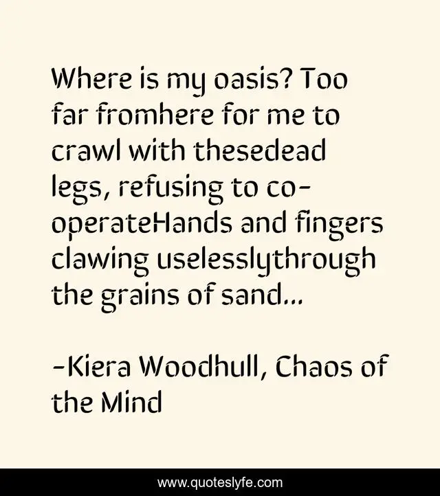 "Kiera Woodhull, Chaos of the Mind Quotes." Quoteslyfe.com, 2025. Sat. 06 Dec. 2025. <https://www.quoteslyfe.com/quote/Where-is-my-oasis-Too-far-fromhere-25222>.