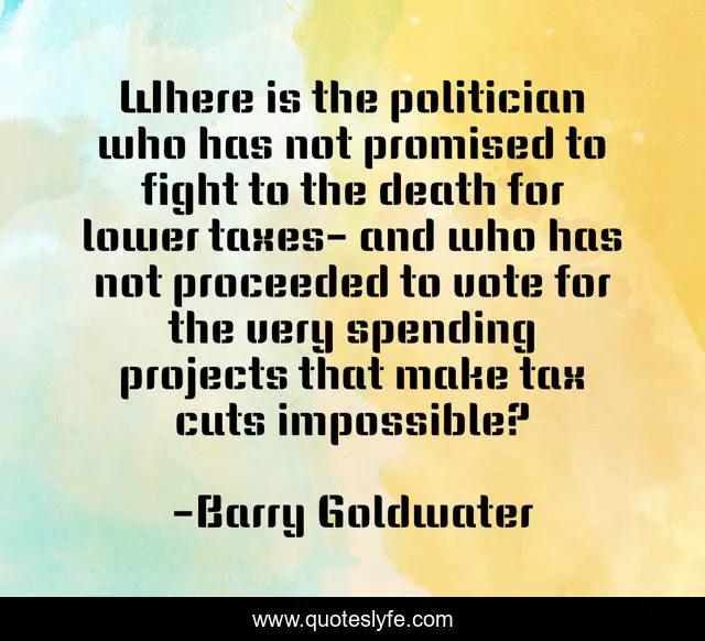 This page presents the quote "Where is the politician who has not promised to fight to the death for lower taxes- and who has not proceeded to vote for the very spending projects that make tax cuts impossible?". Author of this quote is Barry Goldwater. This quote is about vote, impossible, fight,.