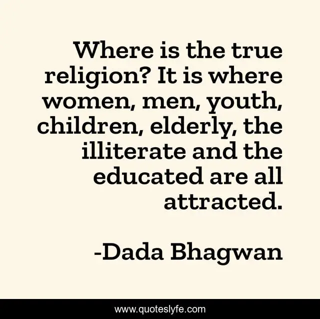 This page presents the quote "Where is the true religion? It is where women, men, youth, children, elderly, the illiterate and the educated are all attracted.". Author of this quote is Dada Bhagwan. This quote is about botheration, god, spiritual, religion, scolding,.