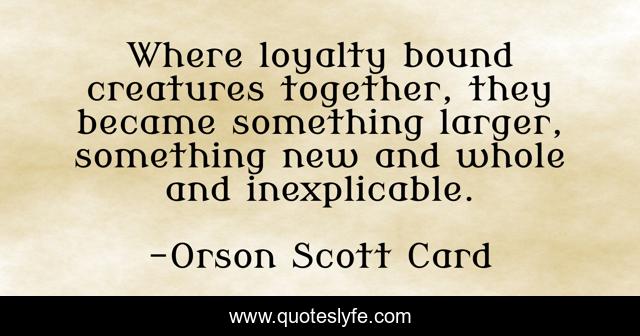 This page presents the quote "Where loyalty bound creatures together, they became something larger, something new and whole and inexplicable.". Author of this quote is Orson Scott Card. This quote is about friendship, love, affection, feelings,.