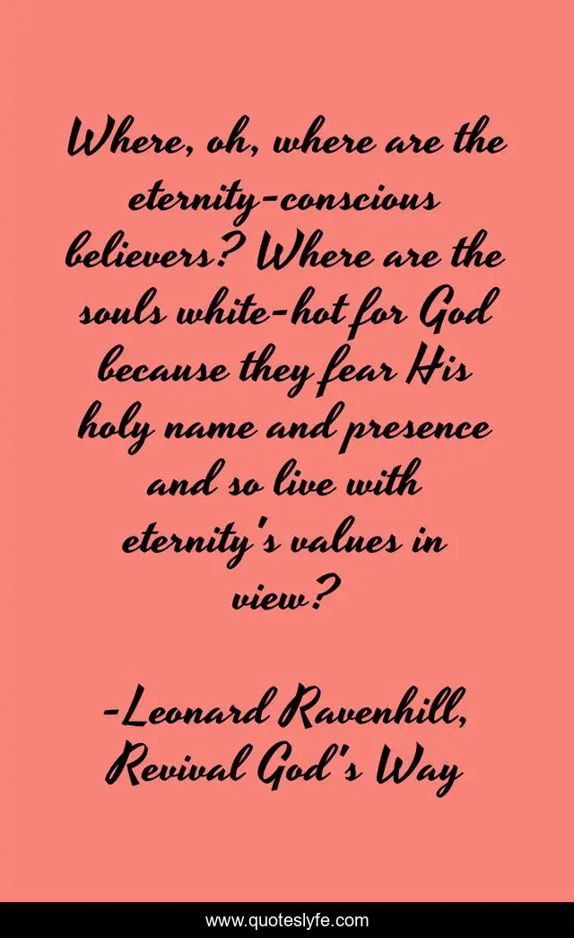 This page presents the quote "Where, oh, where are the eternity-conscious believers? Where are the souls white-hot for God because they fear His holy name and presence and so live with eternity's values in view?". Author of this quote is Leonard Ravenhill, Revival God's Way. This quote is about believers, eternity, ravenhill, god,.