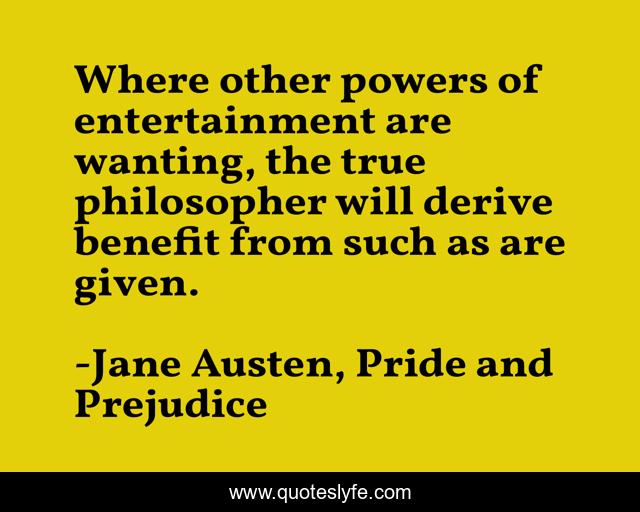 This page presents the quote "Where other powers of entertainment are wanting, the true philosopher will derive benefit from such as are given.". Author of this quote is Jane Austen, Pride and Prejudice. This quote is about contentment, happiness, entertainment,.