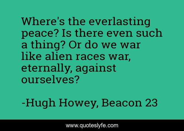 This page presents the quote "Where's the everlasting peace? Is there even such a thing? Or do we war like alien races war, eternally, against ourselves?". Author of this quote is Hugh Howey, Beacon 23. This quote is about peace, war,.