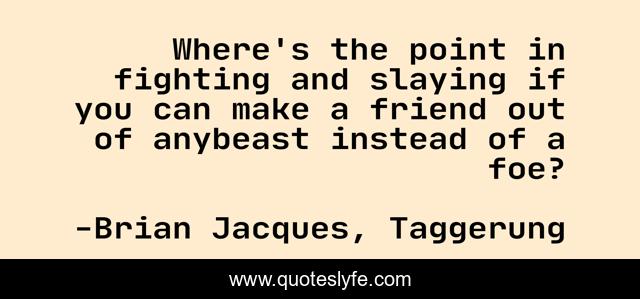 This page presents the quote "Where's the point in fighting and slaying if you can make a friend out of anybeast instead of a foe?". Author of this quote is Brian Jacques, Taggerung. This quote is about peace, friendship,.