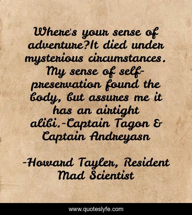 This page presents the quote "Where's your sense of adventure?It died under mysterious circumstances. My sense of self-preservation found the body, but assures me it has an airtight alibi.-Captain Tagon & Captain Andreyasn". Author of this quote is Howard Tayler, Resident Mad Scientist. This quote is about sense-of-adventure, mysterious-circumstances, self-preservation, alibi, humour,.