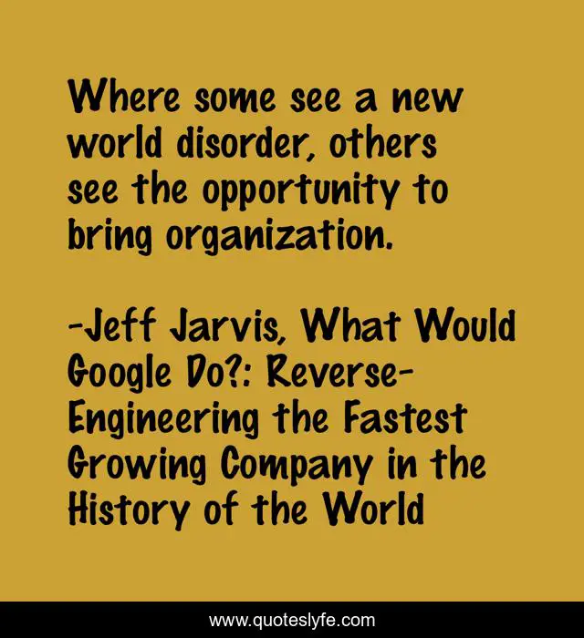 This page presents the quote "Where some see a new world disorder, others see the opportunity to bring organization.". Author of this quote is Jeff Jarvis, What Would Google Do?: Reverse-Engineering the Fastest Growing Company in the History of the World. .