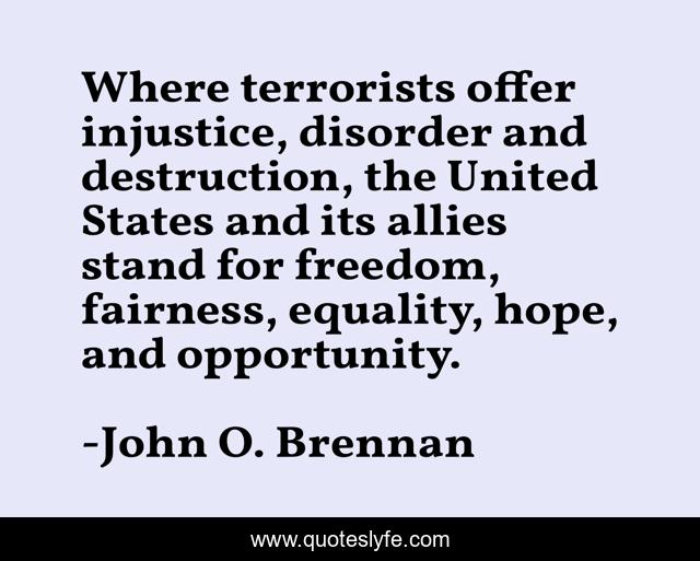 This page presents the quote "Where terrorists offer injustice, disorder and destruction, the United States and its allies stand for freedom, fairness, equality, hope, and opportunity.". Author of this quote is John O. Brennan. This quote is about freedom, opportunity, hope,.