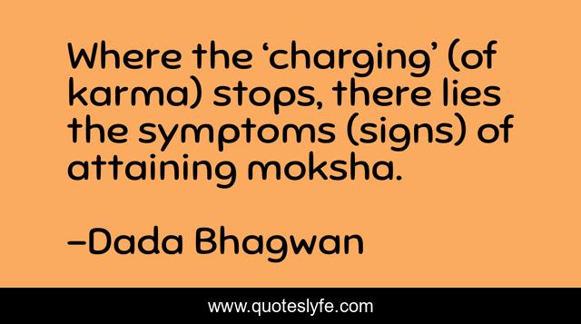 This page presents the quote "Where the ‘charging’ (of karma) stops, there lies the symptoms (signs) of attaining moksha.". Author of this quote is Dada Bhagwan. This quote is about spiritual, moksha, liberation, charge, moksh, karma, discharge,.