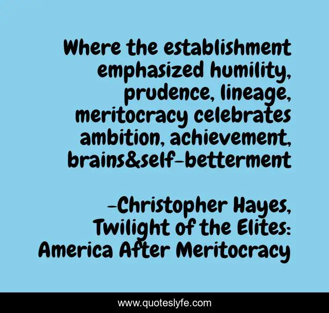 This page presents the quote "Where the establishment emphasized humility, prudence, lineage, meritocracy celebrates ambition, achievement, brains&self-betterment". Author of this quote is Christopher Hayes, Twilight of the Elites: America After Meritocracy. This quote is about noblesse-oblige, advancement, competition, culture, meritocracy, class,.