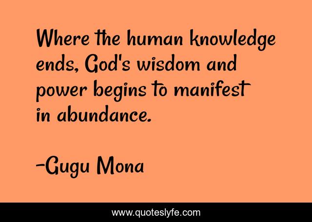 This page presents the quote "Where the human knowledge ends, God's wisdom and power begins to manifest in abundance.". Author of this quote is Gugu Mona. This quote is about ends, power, human-knowledge, manifest, god-s-wisdom, abudance,.