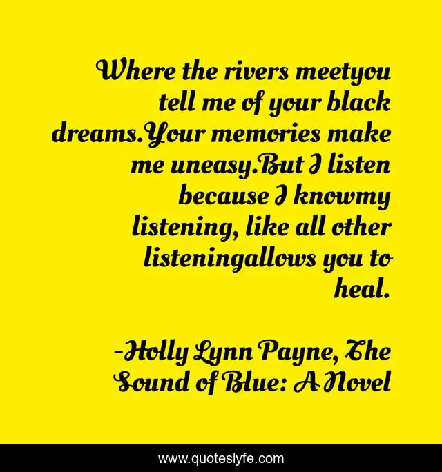 This page presents the quote "Where the rivers meetyou tell me of your black dreams.Your memories make me uneasy.But I listen because I knowmy listening, like all other listeningallows you to heal.". Author of this quote is Holly Lynn Payne, The Sound of Blue: A Novel. This quote is about enthusiasm, heal, dreams, inspirational, listening,.