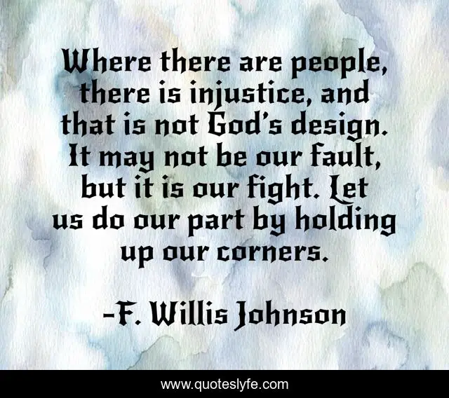 This page presents the quote "Where there are people, there is injustice, and that is not God’s design. It may not be our fault, but it is our fight. Let us do our part by holding up our corners.". Author of this quote is F. Willis Johnson. This quote is about faith, confidence, positive, motivational, holding-up-your-corner, christianity, religion, optimistic, religion-and-philoshophy,.