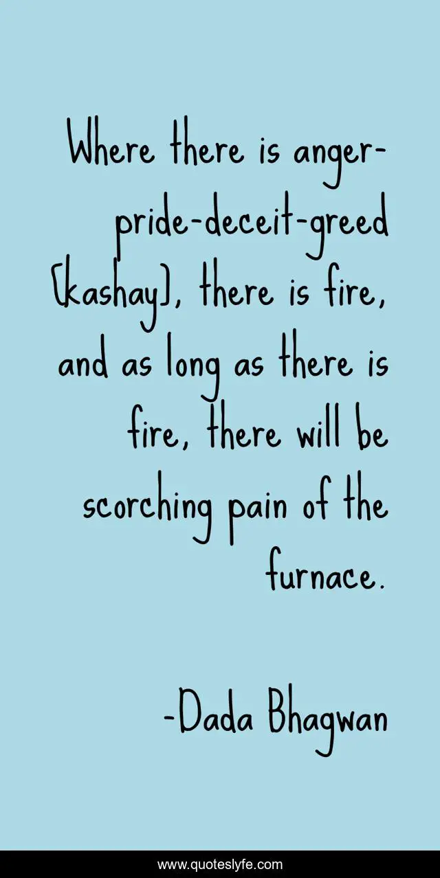 This page presents the quote "Where there is anger-pride-deceit-greed [kashay], there is fire, and as long as there is fire, there will be scorching pain of the furnace.". Author of this quote is Dada Bhagwan. This quote is about fire, spiritual, furnace, anger-pride-deceit-greed-kashay,.