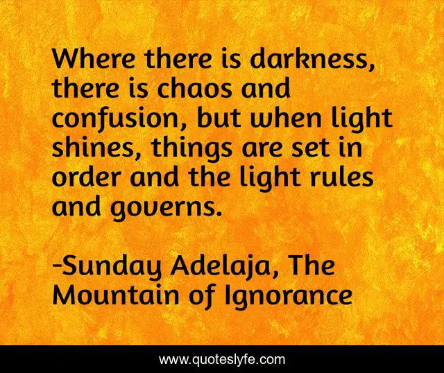 This page presents the quote "Where there is darkness, there is chaos and confusion, but when light shines, things are set in order and the light rules and governs.". Author of this quote is Sunday Adelaja, The Mountain of Ignorance. This quote is about mountain, life, darkness, power, danger, light, people, chaos, rule,.