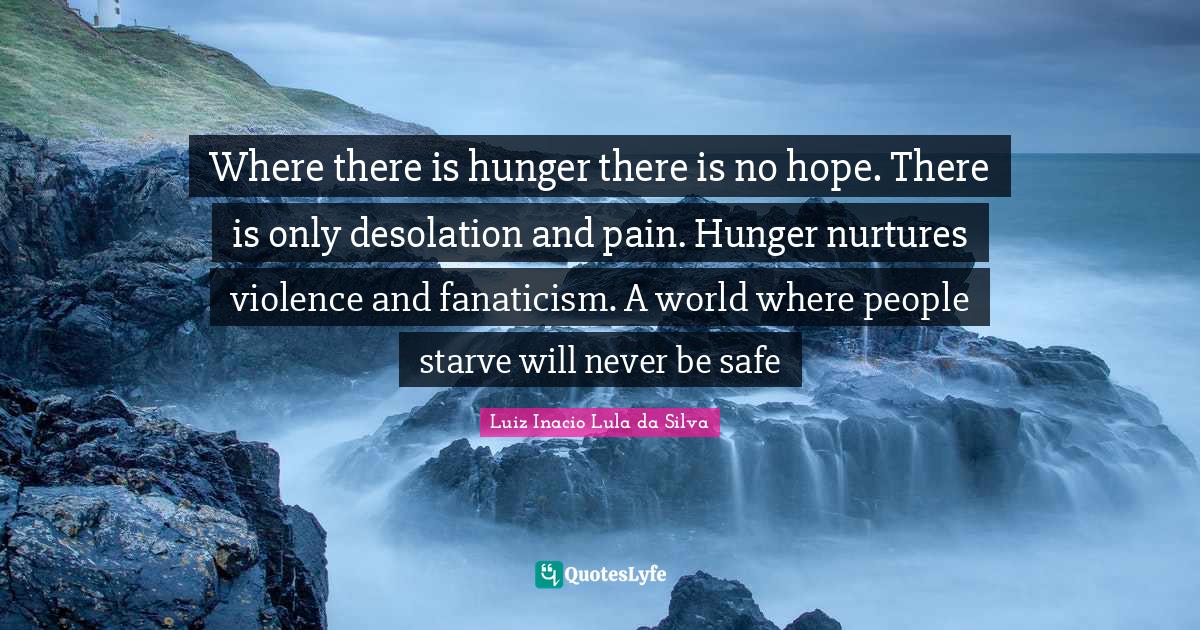 This page presents the quote "Where there is hunger there is no hope. There is only desolation and pain. Hunger nurtures violence and fanaticism. A world where people starve will never be safe". Author of this quote is Luiz Inacio Lula da Silva. This quote is about violence, people, no hope, fanaticism, hunger, safe, pain, desolation, world,.