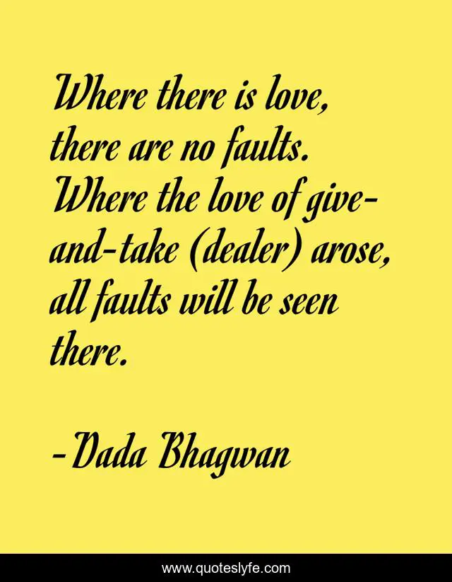 This page presents the quote "Where there is love, there are no faults. Where the love of give-and-take (dealer) arose, all faults will be seen there.". Author of this quote is Dada Bhagwan. This quote is about spiritual, love, fault, give-and-take, faults, no-fault, affection,.