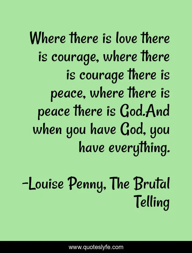 This page presents the quote "Where there is love there is courage, where there is courage there is peace, where there is peace there is God.And when you have God, you have everything.". Author of this quote is Louise Penny, The Brutal Telling. This quote is about god, courage, peace,.