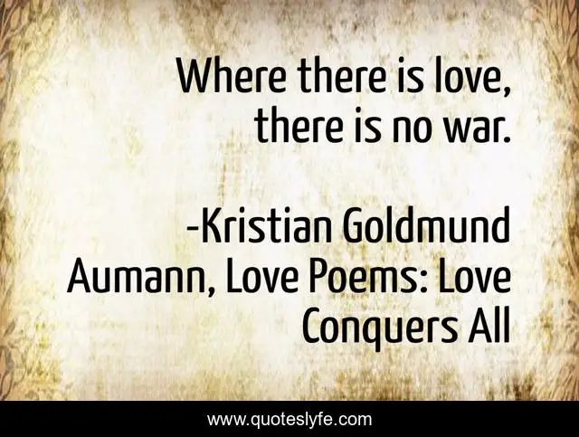 This page presents the quote "Where there is love, there is no war.". Author of this quote is Kristian Goldmund Aumann, Love Poems: Love Conquers All. This quote is about love, war, affection,.
