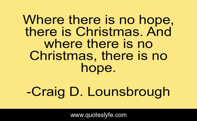This page presents the quote "Where there is no hope, there is Christmas. And where there is no Christmas, there is no hope.". Author of this quote is Craig D. Lounsbrough. This quote is about jesus-christ, god, despondent, jesus, despair, hopelessness, hopeless, holiday, christmas,.