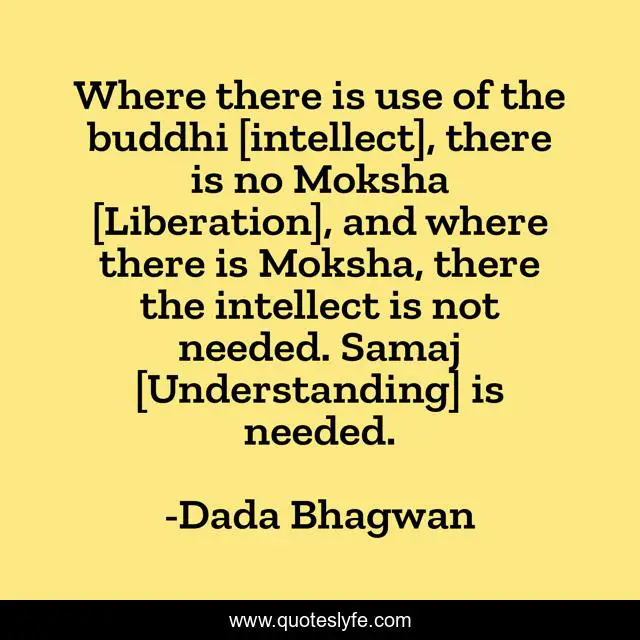 This page presents the quote "Where there is use of the buddhi [intellect], there is no Moksha [Liberation], and where there is Moksha, there the intellect is not needed. Samaj [Understanding] is needed.". Author of this quote is Dada Bhagwan. This quote is about spiritual, moksha, buddhi, intellect, understanding,.