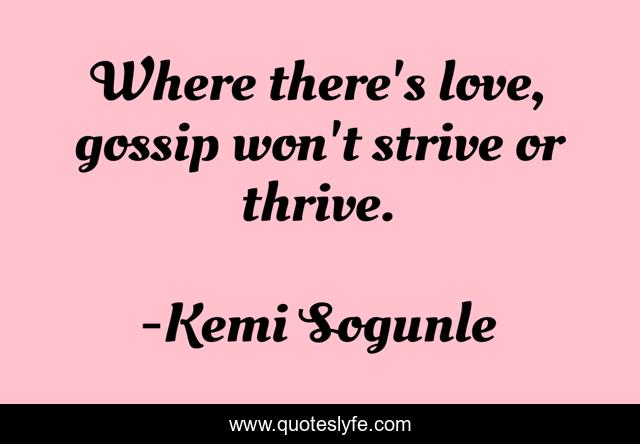 This page presents the quote "Where there's love, gossip won't strive or thrive.". Author of this quote is Kemi Sogunle. This quote is about thriving, reality-of-life, love, truth, affection,.