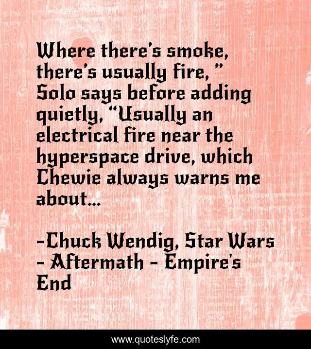This page presents the quote "Where there’s smoke, there’s usually fire, ” Solo says before adding quietly, “Usually an electrical fire near the hyperspace drive, which Chewie always warns me about…". Author of this quote is Chuck Wendig, Star Wars - Aftermath - Empire's End. This quote is about fire, smoke,.