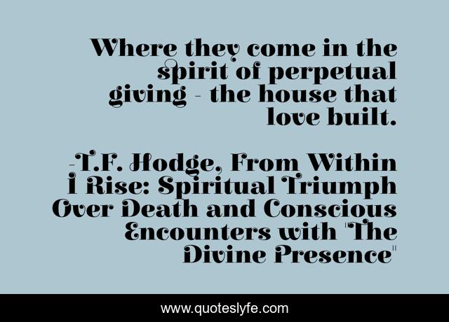 This page presents the quote "Where they come in the spirit of perpetual giving - the house that love built.". Author of this quote is T.F. Hodge, From Within I Rise: Spiritual Triumph Over Death and Conscious Encounters with "The Divine Presence". This quote is about love, companionship, soul-mates, giving, blessing, gift, marriage, intimacy, honor,.