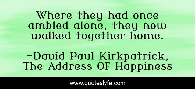 This page presents the quote "Where they had once ambled alone, they now walked together home.". Author of this quote is David Paul Kirkpatrick, The Address Of Happiness. This quote is about alone, home, soulmates,.