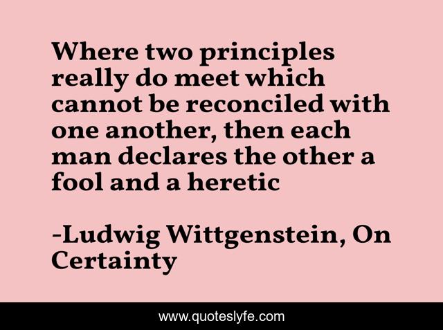 This page presents the quote "Where two principles really do meet which cannot be reconciled with one another, then each man declares the other a fool and a heretic". Author of this quote is Ludwig Wittgenstein, On Certainty. This quote is about negotiation, heretics, fools, ideas,.